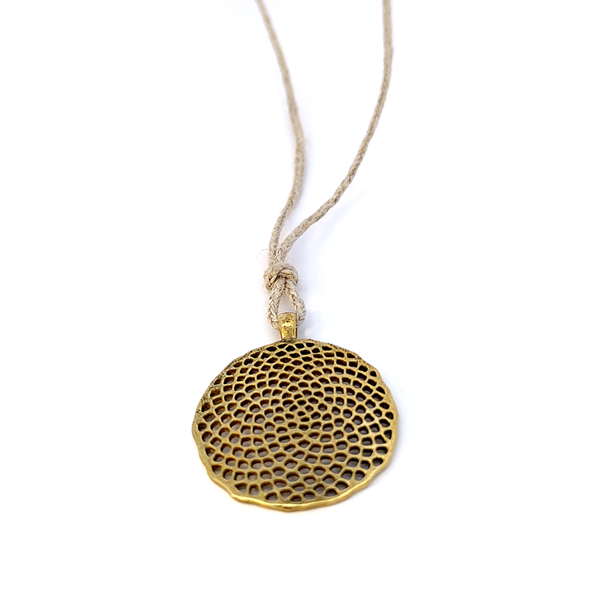 Medalla de Latón. Medida: 27 mm de diámetro. La medalla incluye un cordón de lino de color crudo. Producto de producción local elaborado artesanalmente.