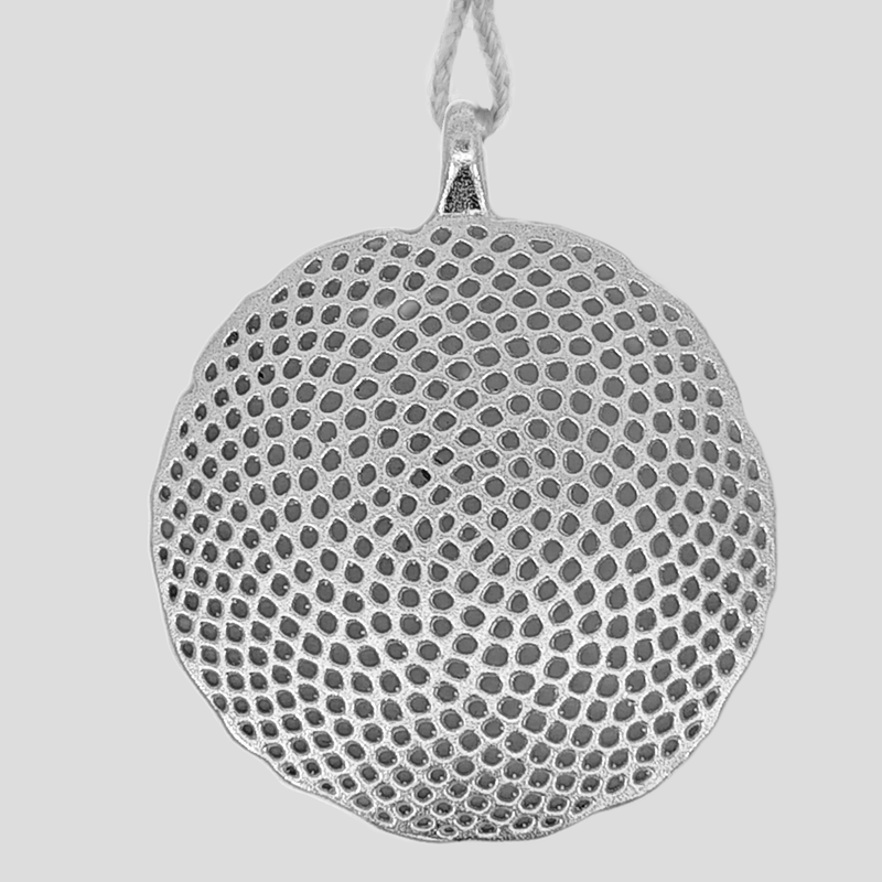 Medalla de Plata de llei. Mida: 45 mm de diàmetre. La medalla inclou un cordó de lli de color cru. Producte de producció local elaborat artesanalment. (Els preus dels productes de plata poden variar en funció dels increments del material)